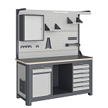 Нагрузка на столешницу 1500 кг. Столешница из листа влагостойкой фанеры марки ФСФ толщиной 40 мм и листом горячекатаной стали толщиной 5 мм. Рама верстака выполнена их холоднокатаной стали. Модуль верстака выполнен сварными. Ящики в модулях устанавливаются на шариковых телескопических направляющих полного выдвижения. Квадратная перфорация для установки крючков, держателей. Размеры: 1982x1993x743 мм.