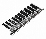 Головки изготовлены из закаленной хром-ванадиевой стали. Полированная поверхность. В набор входит планка крепления и хранения головок.Набор 9 предметов (Е10, Е11, Е12, Е14, Е14, Е16, Е18, Е20, Е22, Е24).
