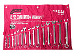 Набор ключей рожково-накидных в планшете 15 предметов. В комплекте: 6, 7, 8, 9, 10, 11, 12, 13, 14, 15, 16, 17, 18, 19, 21 мм. Зеркальная полировка. Материал: хром-ванадиевая сталь, повышающий износостойкость инструментов.
