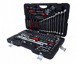 Набор инструментов в чемодане 1/4" & 1/2" 6-гранный 156 предметов. В наборе: головки 1/2", 1/4" (6РТ), головки глубокие 1/2", 1/4" (6РТ), головки TORX 1/2", 1/4", трещотка 1/2", 1/4", удлинитель 1/2", 1/4", кардан 1/2", 1/4", вороток-отвертка 1/4", держатель для бит 1/4", переходник 3/8", свечная головка 1/2" (6РТ и 12РТ), держатель для бит 5/16", вороток с шарниром 380 мм, вороток Г-образный 260 мм, биты 1/4", биты 5/16", ключи рожково-накидной: 6-24 мм, ключи разрезные, Г-образный ключ HEX, пассатижи 7", бокорезы 6", клещи с фиксатором 10", молоток 500 г, набор выколоток и зубил, отвертки с антискользящей рукояткой.