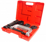 Для снятия/установки запрессованных элементов: шаровых опор, карданного шарнира с крестовиной, анкерных пальцев барабанных тормозов и других аналогичных работ. Размер струбцины: 165 мм. Размер насадок: 69 мм, 56 мм, 45 мм.