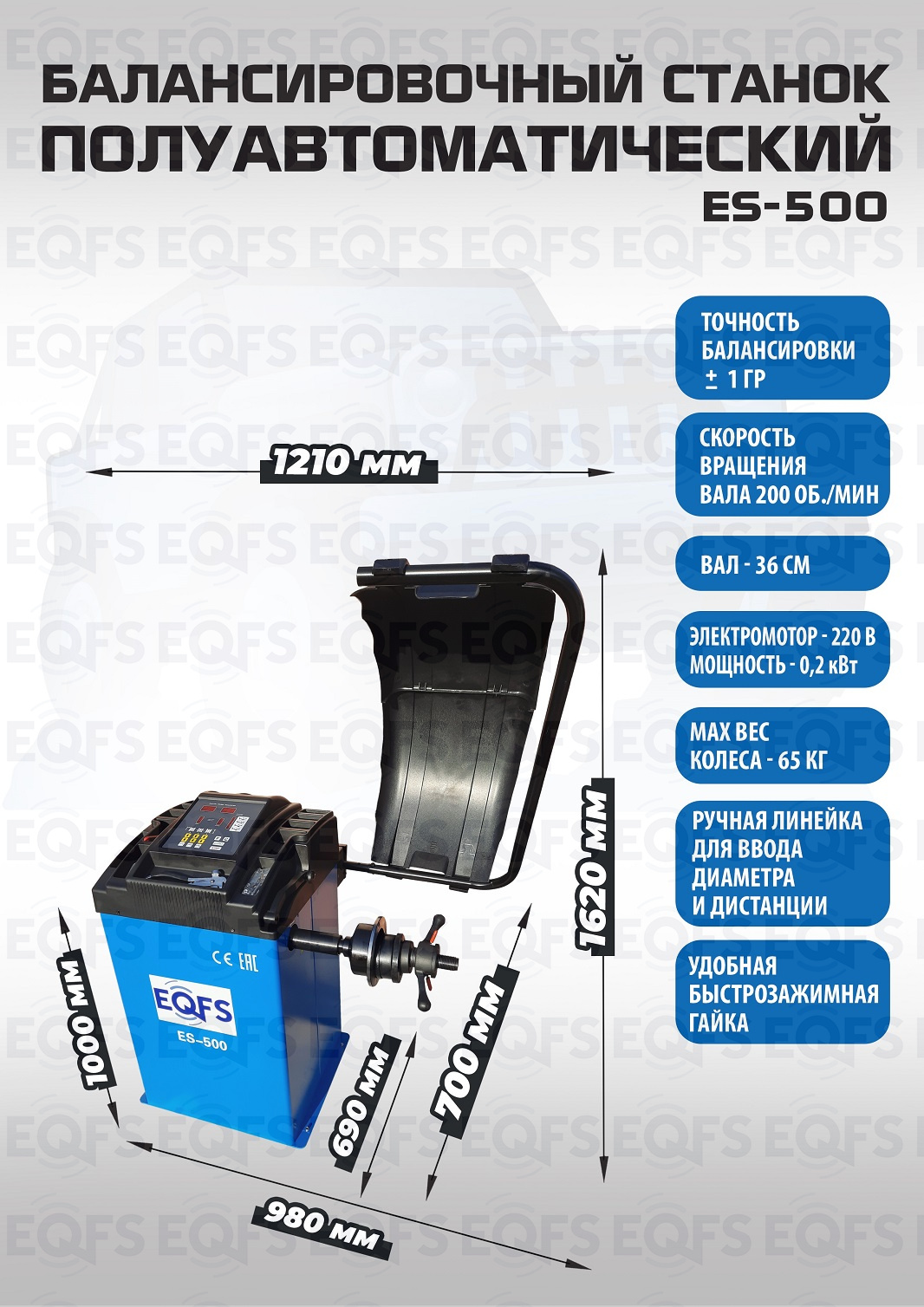 + ES-500 Балансировочный станок для колес легковых автомобилей, мотоциклов и легких грузовиков с диаметром диска с резиной до 760 мм. Размеры диска: ширина 3–9” (76-228 мм) , диаметр диска" -  10–21” (254-533 мм). Вал-36 мм. Максимальный вес колеса с диском – 65 кг. C кожухом. Точность ±1гр. Напряжение 220В.  В комплекте: кожух с автозапуском + клещи + кронциркуль + быстрозажимная гайка + набор конусов.