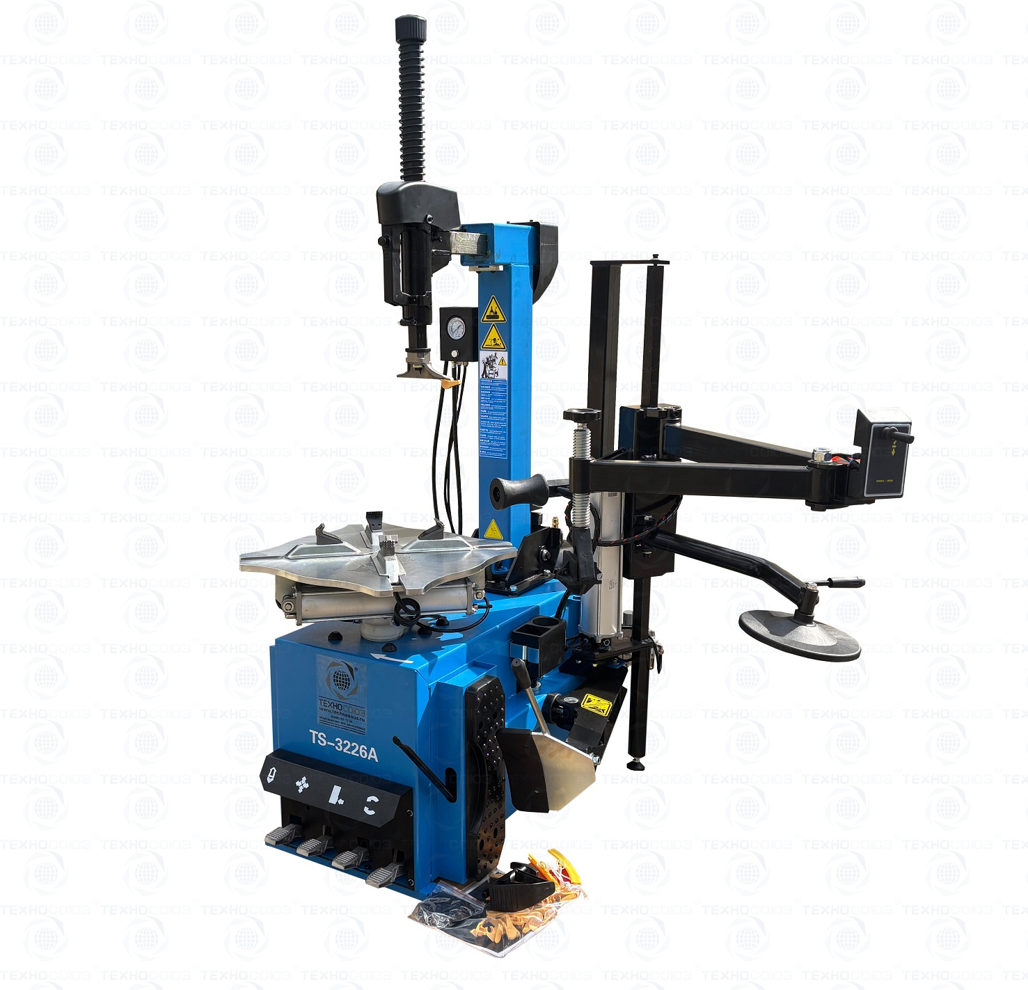 Комплект из автоматического шиномонтажного станка TS-3226А для колес легковых автомобилей, легких грузовиков, не больших автобусов и коммерческой техники. Для дисков: 11÷24”. В комплекте: полноценная 3-я рука для работы с жесткой и низкопрофильной резиной RUNFLAT. + встроенный бустер 24 литра (взрывная подкачка) + пистолет для подкачки шин + монтажка + регулятор давления с влагоотделителем и манометром.