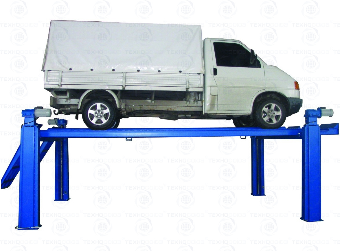Электромеханический подъемник. Подъемник обеспечивает подъём любых автомобилей снаряженной массой до 5 тонн. Может устанавливаться на бетонируемые в пол рамы или на напольные рамы закрепляемые на полу анкерными болтами. Напольные рамы и анкерные болты поставляются вместе с подъемником по отдельному заказу. Рабочие гайки выполнены из полиамида повышенной прочности и износостойкости. Многоуровневая система безопасности. Привод ходового винта от червячного мотор-редуктора. По отдельному заказу подъёмники могут быть укомплектованы тележкой с домкратом для вывешивания передней или задней оси автомобиля. Подъемник комплектуется микропроцессорной системой синхронизации подъёма-опускания платформ. Подъемник специально разработан для установки стенда регулировки развала-схождения передних колес автомобилей.