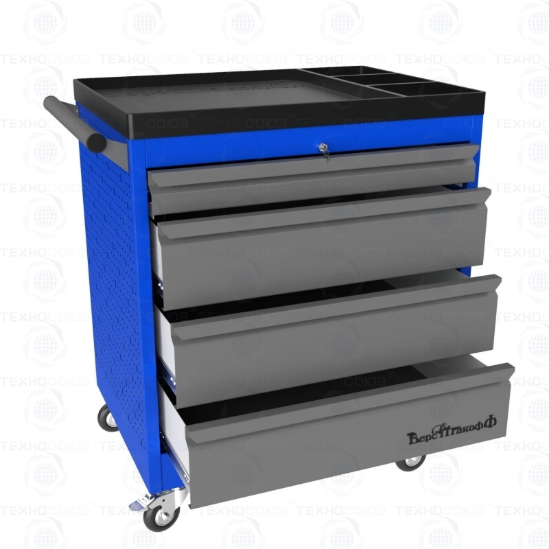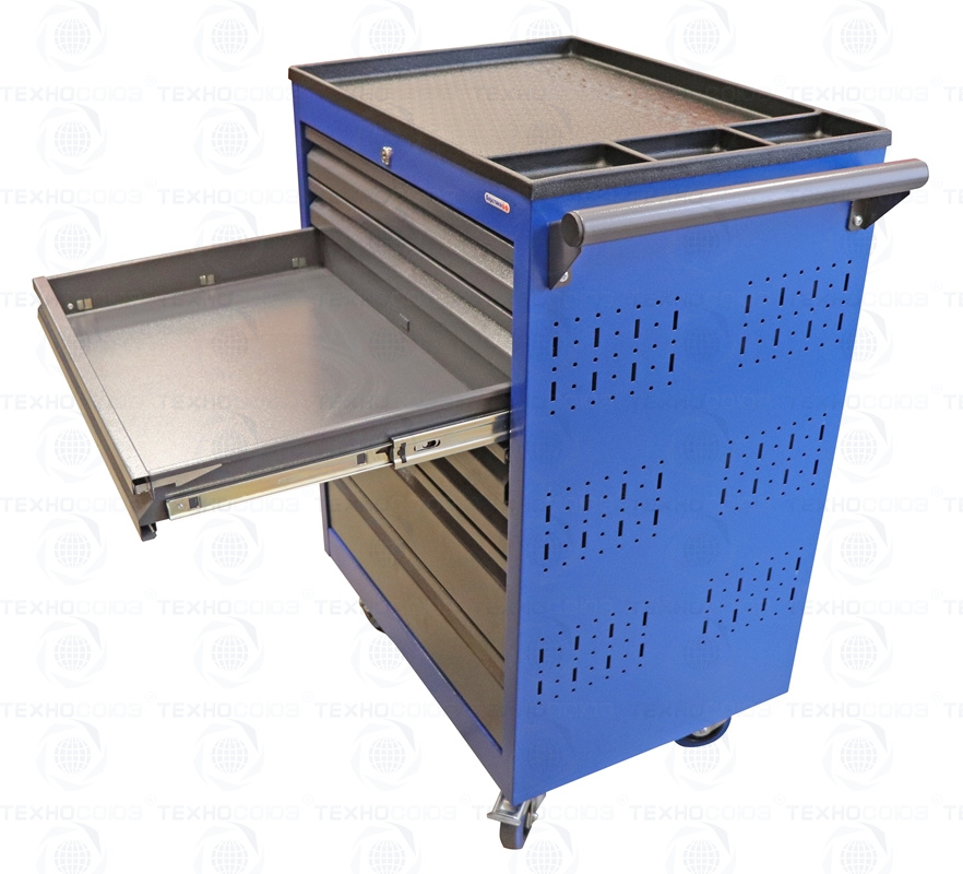 Тележки инструментальные серии PROFFI 795 предназначены для использования на предприятиях любого профиля занятых ремонтом и изготовлением различной продукции. Тележки изготовлены высотой 795 мм что позволяет размещать их под верстаками и рабочими столами серии PROFFI, что позволяет сэкономить рабочее пространство помещении. На боковые стенки инструментальной тележки нанесена перфорация размером 25х25 мм и диаметром отверстия 8 мм, что позволяет устанавливать на них навесной инструмент или крючки. Наибольшей популярностью тележки инструментальные пользуются в сфере авторемонта и обслуживания автомобилей. Тележки имеют выдвижные ящики на шариковых телескопических направляющих полного выдвижения с фиксацией в закрытом положении, предотвращающее открывание при передвижении тележки. Ящики имеют центральный замок, который позволяет ограничить доступ посторонних лиц к содержимому ящиков. Тележка инструментальная изготовлена из высококачественного металла ведущих Российских производителей, покрашена порошковой краской производства Германии, имеет итальянскую и турецкую фурнитуру. Тележки для инструмента оснащены двумя не поворотными колесами диаметром 100 мм, одним поворотным и одним поворотным со стопором, которое фиксирует тележку и предотвращает непроизвольное скатывание.