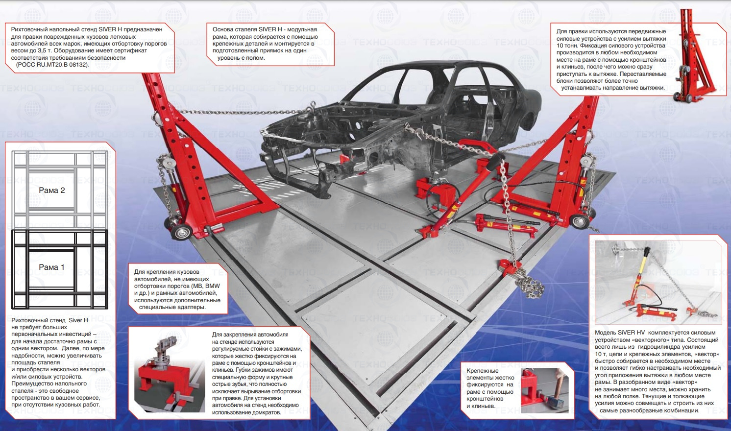 Рама CH-01, 2 силовых устройства CH-10, 2 ручных гидронасоса, комплект захватов за отбортовку порогов (4 шт.), комплект оснастки Siver Standart-2