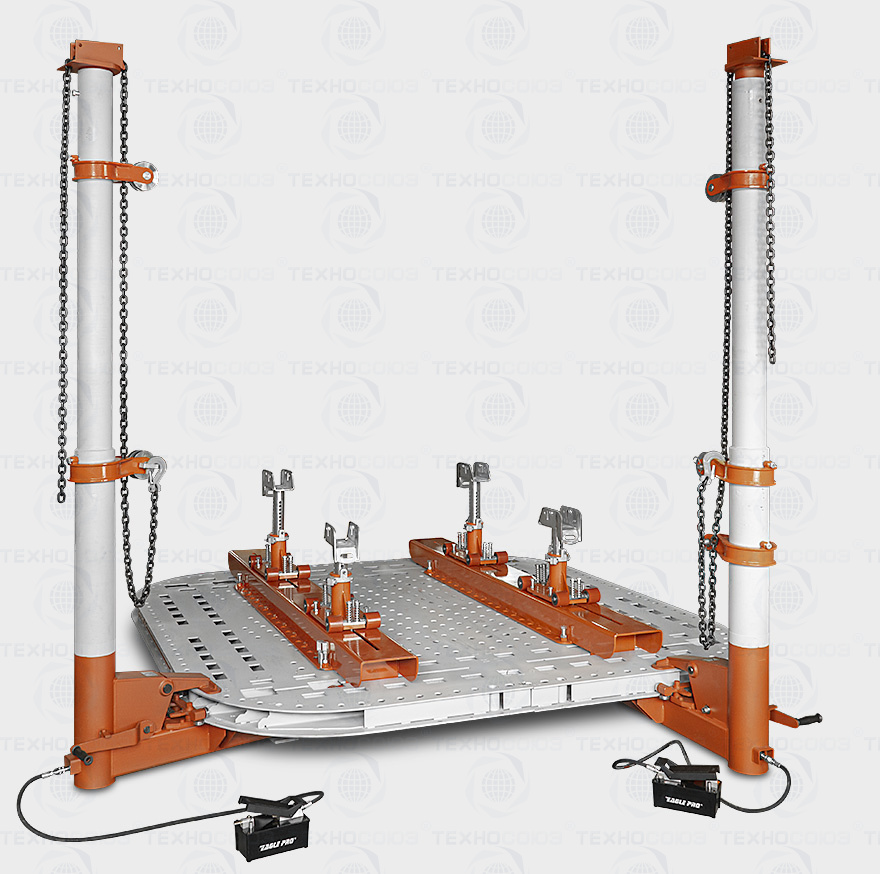 Силовые устройства башенного типа высотой 3 м оснащены гидроцилиндрами 10 т и позволяют быстро и эффективно восстановить геометрию вертикальных элементов каркаса и крыши кабины. Для управления силовыми устройствами используются пневмогидравлические насосы.