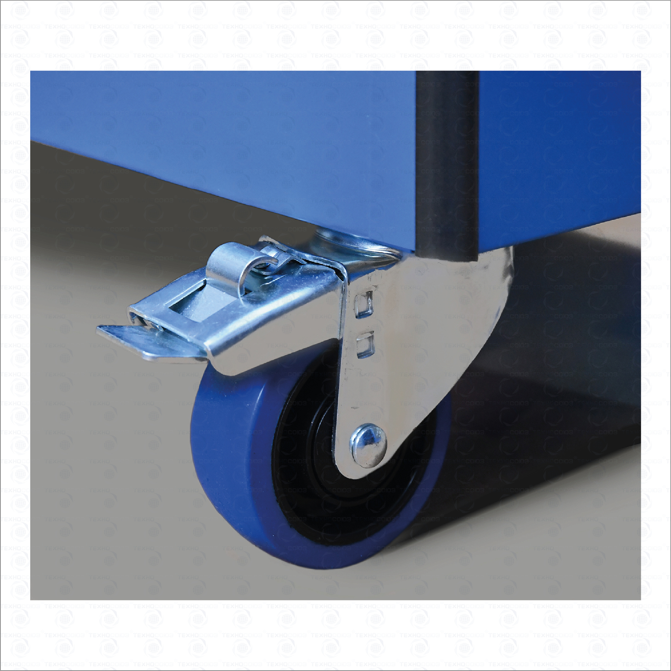 Тележка оснащена четырьмя колесными опорами с диаметром колеса 100 мм. Две поворотные колесные опоры с тормозом и две поворотные колесные опоры без тормоза.