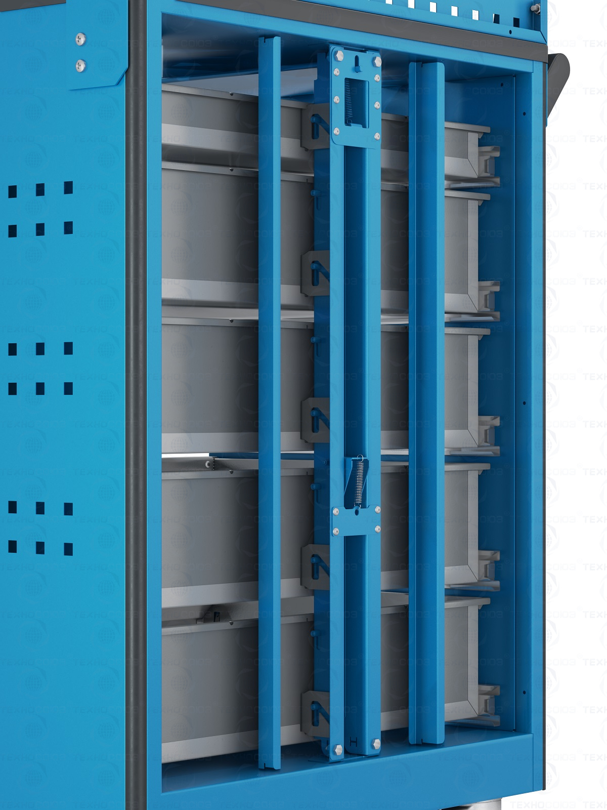Перфоэкран предназначен для размещения навесных элементов. Корпус тележки сварной. На боковых стенках корпуса выполнена квадратная перфорация 12х12 мм с шагом 38 мм для установки крючков, держателей и других аксессуаров. Ящики устанавливаются на шариковых телескопических направляющих полного выдвижения. Обеспечен свободный и плавный ход ящиков даже при полной загрузке. На лицевой панели каждого ящика установлена ручка-накладка. Каждый ящик снабжен клавишной системой антиоткрывания из оцинкованной стали, препятствующей самопроизвольному выдвижению ящиков, например, при наклоне или перемещении тележки. Тележка оснащена системой антиопрокидывания новой конструкции, которая блокирует открывание ящиков, если один из них уже выдвинут. Это препятствует смещению центра тяжести и предотвращает опрокидывание тележки. На углах тележки установлены специальные резиновые защитные бамперы. Тележка оснащена четырьмя колесными опорами с диаметром колеса 100 мм. Две поворотные колесные опоры с тормозом и две поворотные колесные опоры без тормоза.