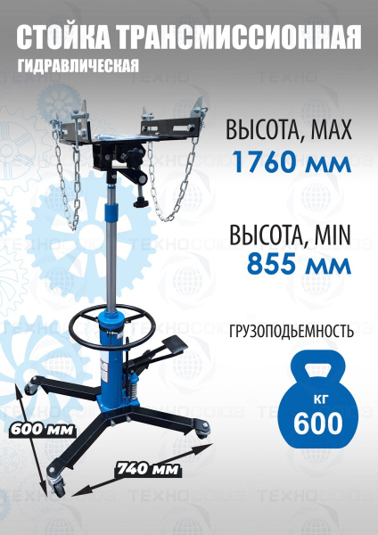 Стойка трансмиссионная гидравлическая двухступенчатая г/п 600кг. Низкая. Подъём 855-1760 мм. Доставка РФ + страны таможенного союза. Оборудована площадкой и страховочной цепью, для фиксации обслуживаемого агрегата.