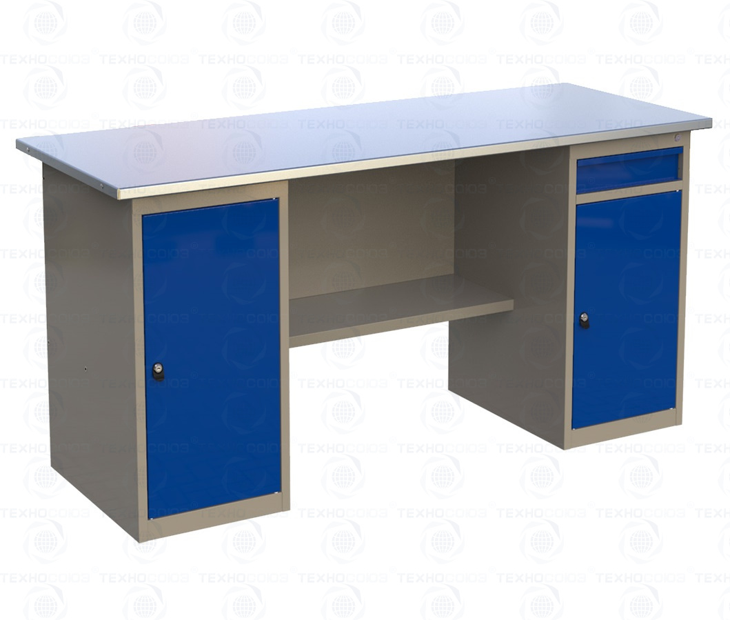 Верстак двухтумбовый поставляется в разобранном виде (4 элемента). Нагрузка на столешницу до 600 кг. Стандартный цвет: корпус - серый глянец RAL 7030, ящики и двери тумб - синий RAL 5017. Размеры: 855x1800x700 мм. Масса: 91 кг.