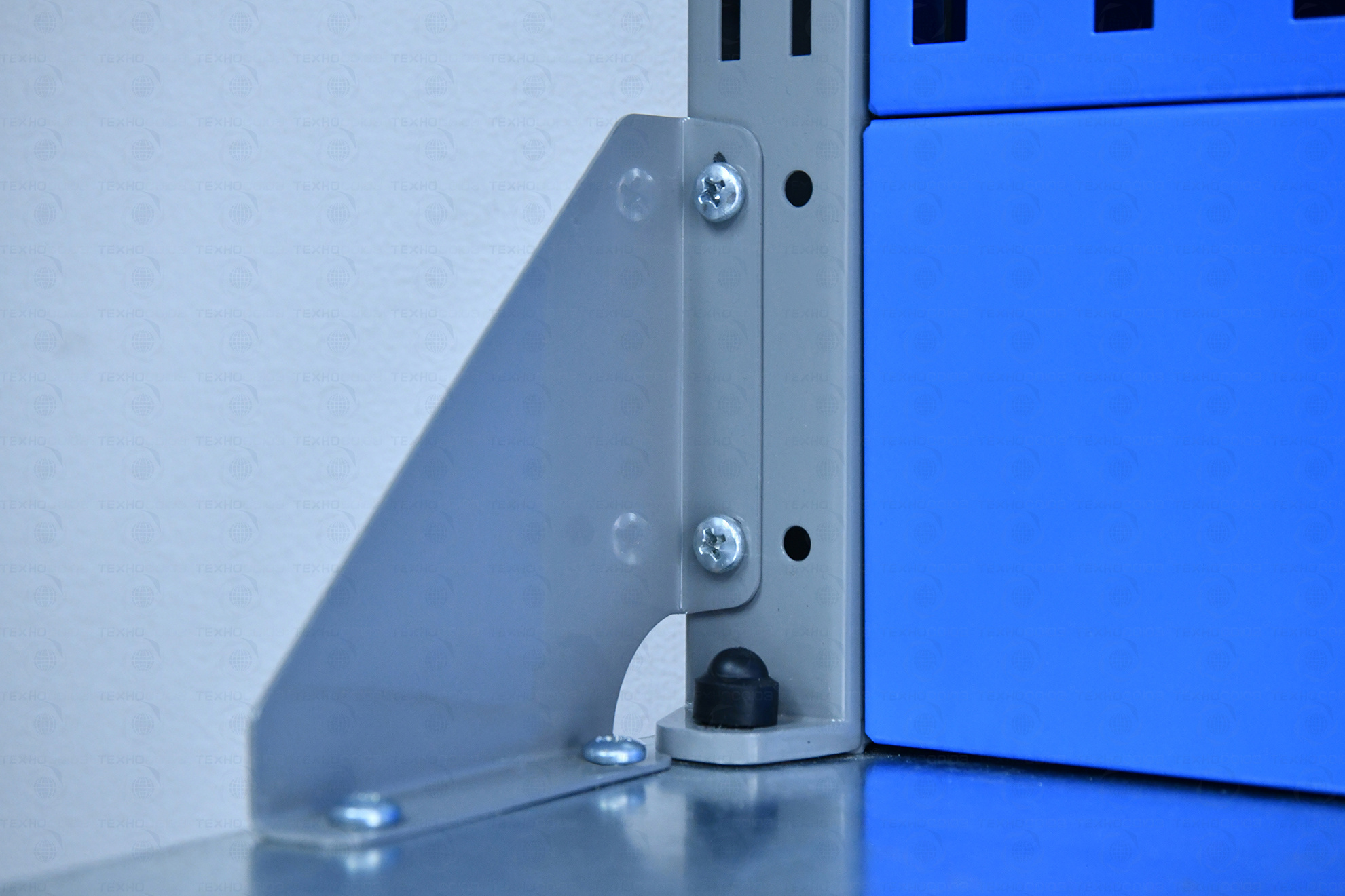 Тумба верстака - сварная. Ящики в тумбе устанавливаются на шариковых телескопических направляющих полного выдвижения. В тумбе P8 установлен малый ящик и имеется отделение с дверью и одной полкой. Внутренние размеры малых ящиков (ВхШхГ), не более: 103 х 397 х 520 мм. Ящик снабжен центральным замком с поворотом ригеля 180 градусов и подпружиненной тягой. В комплекте два ключа. Полка устанавливается на парах специальных формованных зацепов, выполненных в боковых стенках тумбы. Имеется возможность смены стороны открывания двери. Дверь тумбы снабжена центральным замком с поворотом ригеля 180 градусов. В комплекте имеется два ключа.